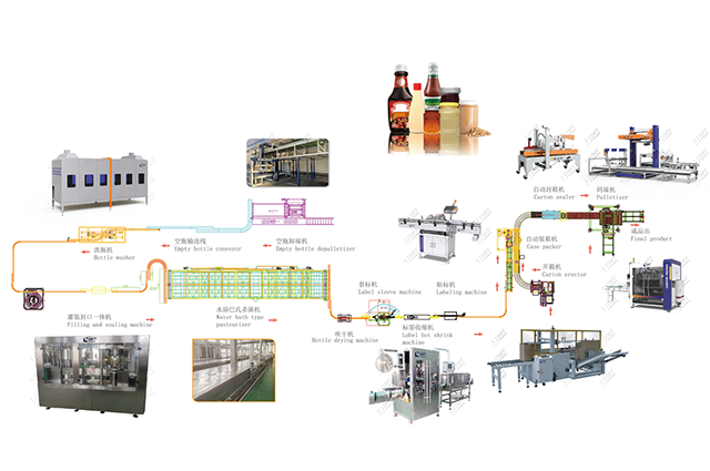 空瓶卸垛——洗瓶——自動(dòng)濃醬灌裝機(jī)——玻璃瓶封口機(jī)——?dú)⒕鷻C(jī)——套標(biāo)機(jī)——貼標(biāo)機(jī)——開(kāi)箱機(jī)——裝箱機(jī)——封箱機(jī)——碼垛機(jī)