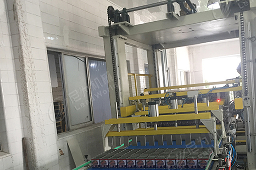 1、自動碼垛:罐頭通過鏈道堆積到輸送線上,開動機(jī)器,罐頭被吸起并放到指定的位置上,重復(fù)相同的動作,直至將罐頭碼成整垛由叉車叉出。