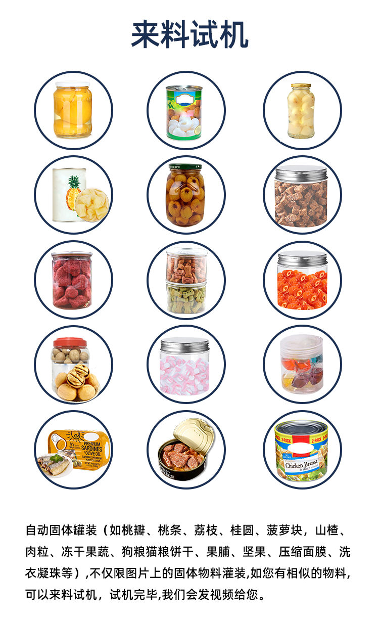 本機(jī)廣泛適用于玻璃罐、馬口鐵罐、塑料罐及廣口瓶等多種容器類型。它主要用于沙丁魚、黃桃瓣、桃條、桃丁、梨塊、梨球、山楂、草莓、葡萄、杏、荔枝、紅燒肉、雞肉等罐頭產(chǎn)品的自動(dòng)計(jì)量與裝罐,展現(xiàn)出廣泛的適用性。