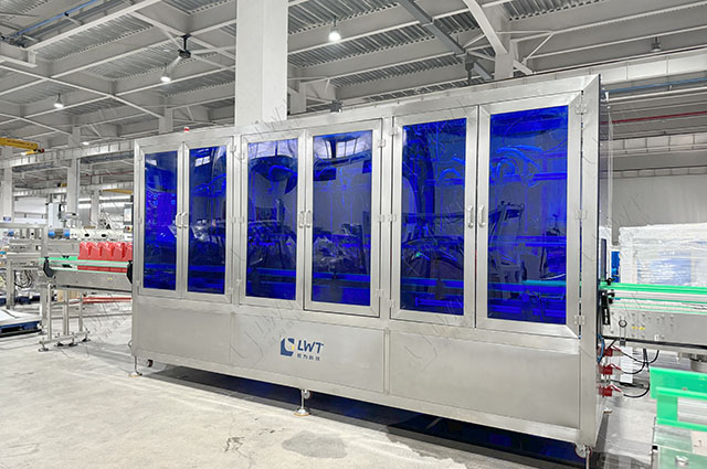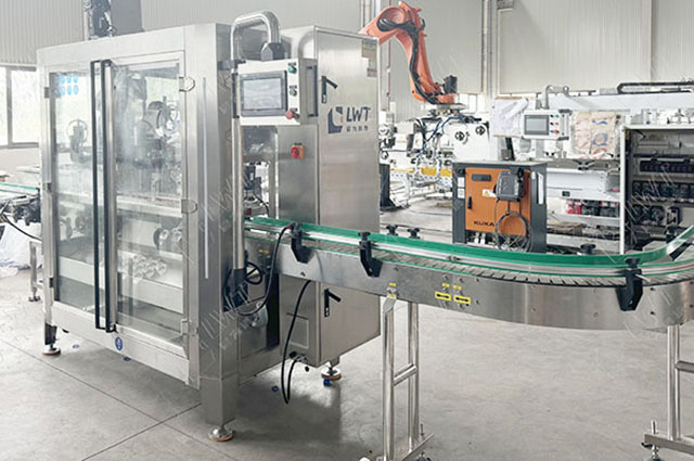 清潔劑灌裝生產(chǎn)線工作流程:灌裝——旋蓋——稱重檢測——膜包收縮——機(jī)器人碼垛——纏繞
