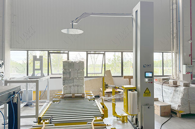 對碼垛后的產(chǎn)品進(jìn)行纏繞,增強(qiáng)穩(wěn)固性。