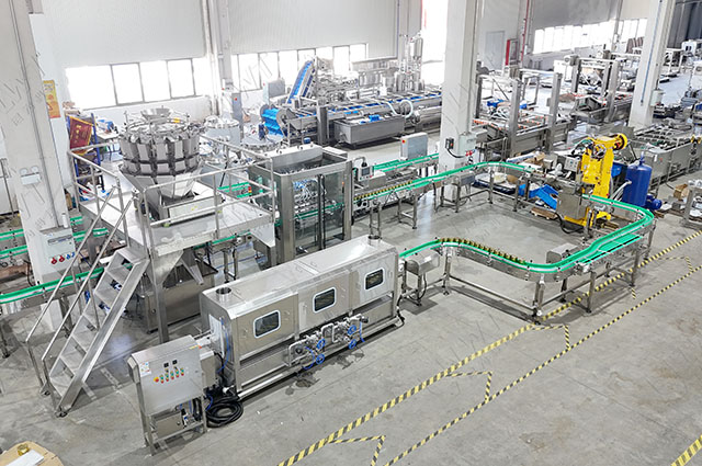 鼓泡清洗-預(yù)煮—振動(dòng)瀝水——固體物灌裝——液體灌裝——封口機(jī)——實(shí)罐清洗——稱重檢測——自動(dòng)封箱