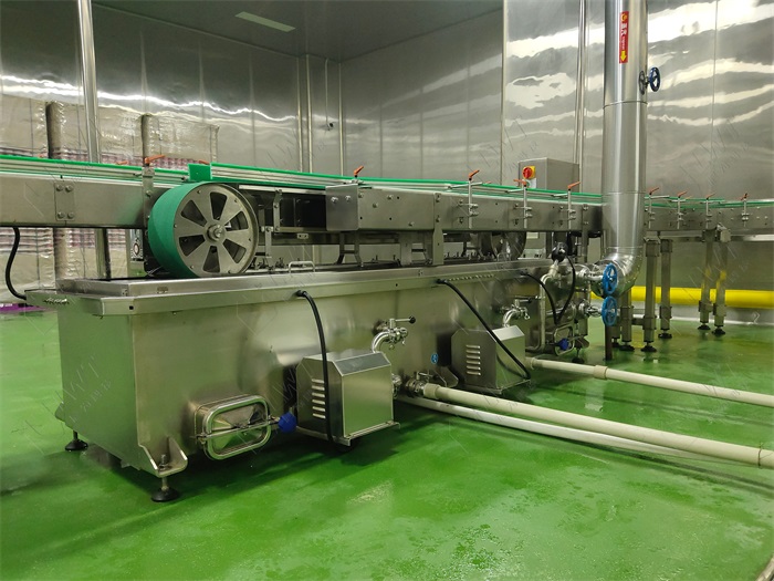 清洗 -> 2. 去皮 -> 3. 打漿/破碎 -> 4. 調(diào)配 -> 5. 融糖 -> 6. 均質(zhì) -> 7. 預(yù)熱 ->8. 空罐卸垛 -> 9. 空罐清洗(高壓噴淋) -> 10. 空罐吹干/瀝干 ->11. 自動(dòng)灌裝 -> 12. 抽真空/蒸汽噴射(排除罐頂空氣) -> 13. 真空封口 ->14. 殺菌 -> 15. 冷卻 -> 16. 吹干(去除表面水漬)-> 17. 噴碼 -> 18. 貼標(biāo) -> 19. 自動(dòng)開箱 -> 20. 自動(dòng)裝箱 -> 21. 自動(dòng)封箱 -> 22. 機(jī)器人碼垛 -> 23. 成品入庫(kù)