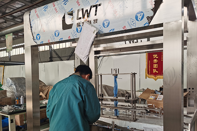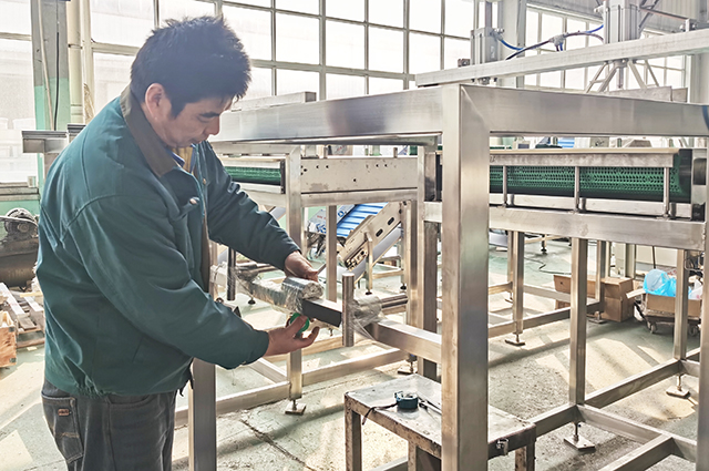 這臺目前正在組裝中的設備是我們的活塞灌裝機,該灌裝機將被用來灌裝番茄醬。設備采用304不銹鋼,不僅保證了設備外觀干凈美觀,也方便設備清洗和保養(yǎng)。