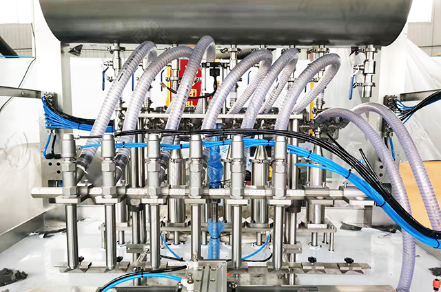 這臺設備是8頭灌裝機,一般我們的灌裝頭數(shù)量視產(chǎn)量而定,直線式的建議4~12頭,否則灌裝速度反而達不到預期。